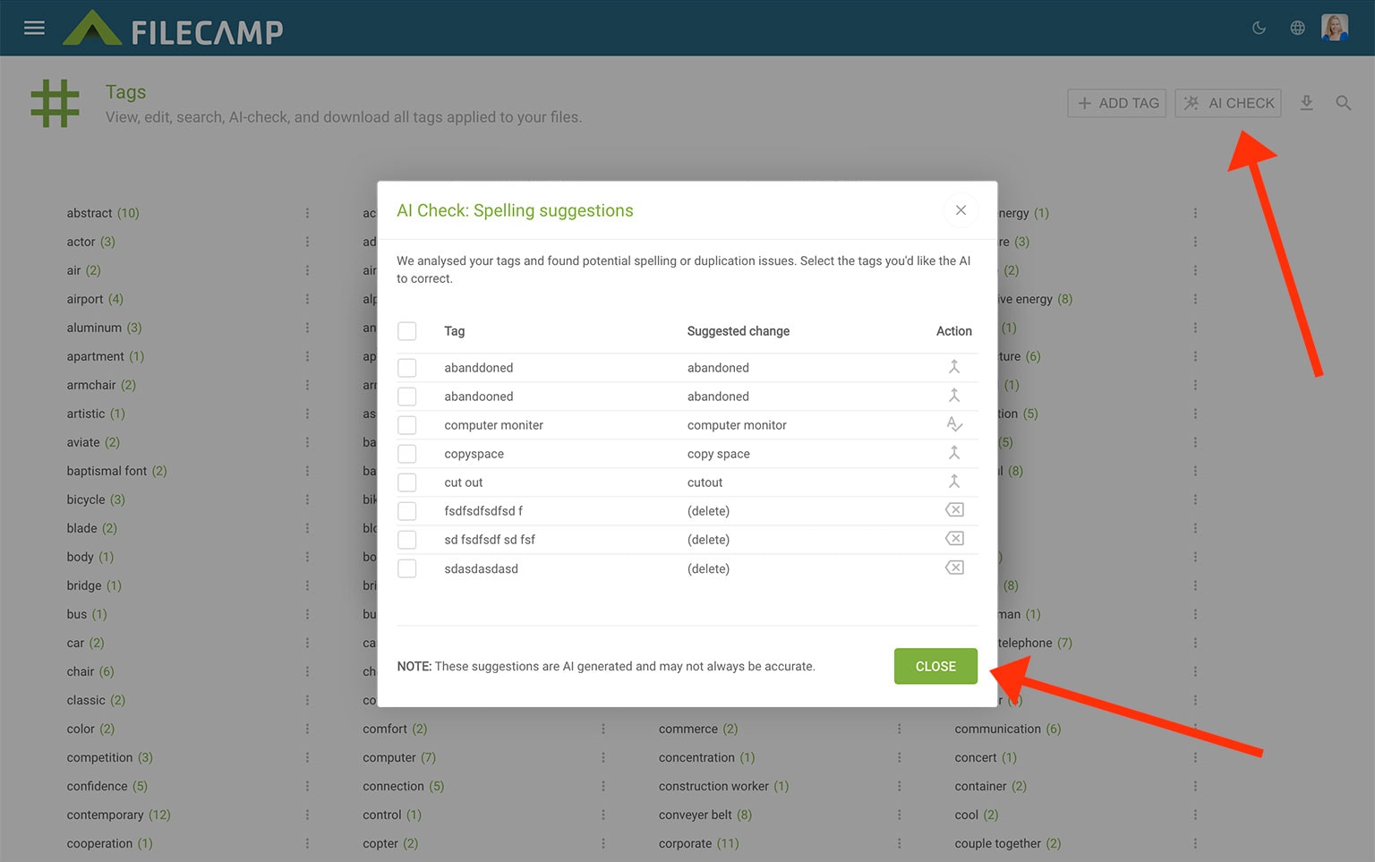 You can also let AI correct your tags. It will suggest tags to merge, rename, or delete. Select the tags you want to update and click APPLY.